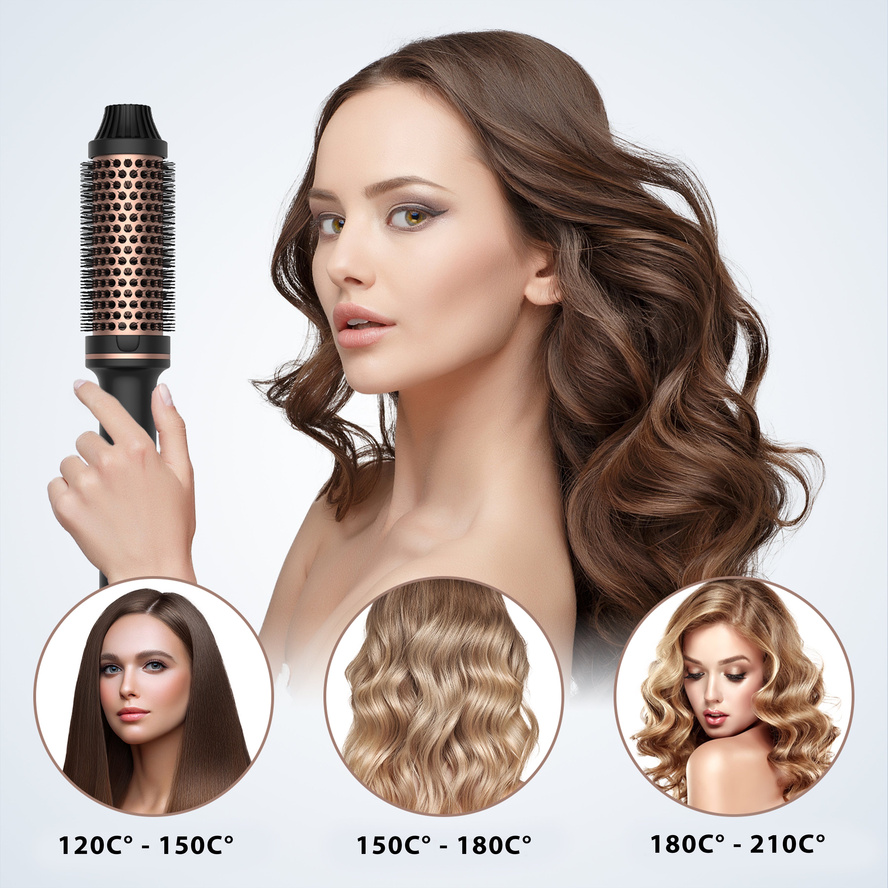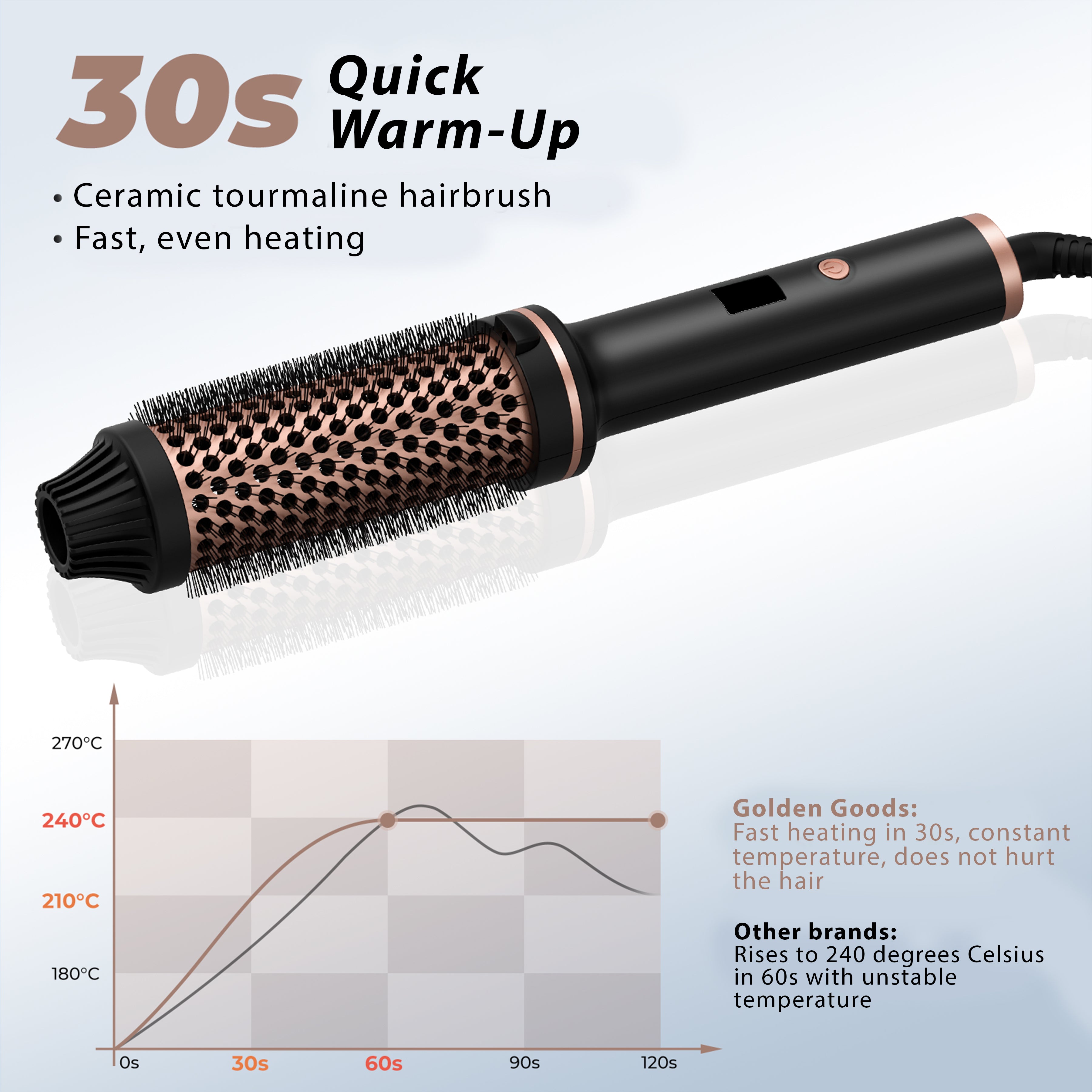 The Golden Goods volume-creating hot brush. The hot brush contains a round ceramic brush of 38 mm (diameter), with which you can give the hair body and bounce over the entire hair length. Regardless of hair type and hair length, you can quickly and easily create various looks, ranging from sleek and voluminous hair to a beautiful blowout look and irresistible curls.